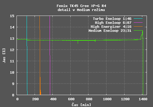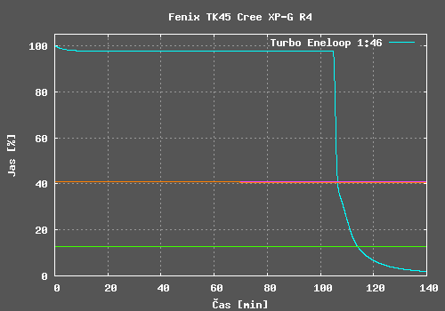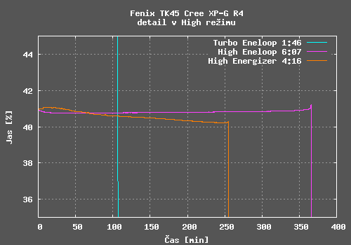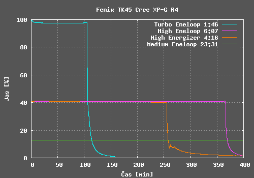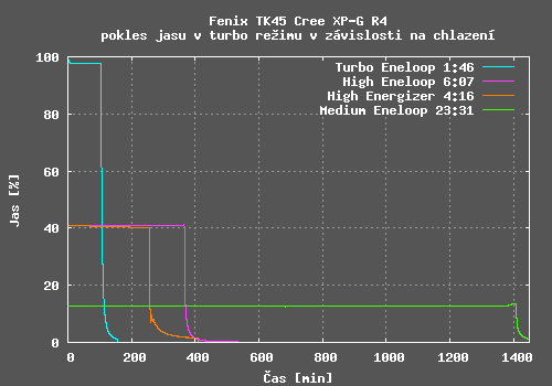 Potěšilo mě, že hodnoty výdrže udávané výrobcem jsou skutečně dosažitelné. Kvalita regulace konstantního jasu je u svítilen Fenix tradičně velmi dobrá a TK45 není výjimkou. V Turbo režimu dochází k poklesu jasu z důvodu zahřání svítilny, velikost poklesu je závislá na chlazení svítilny. V High režimu a Medium režimu jsou i detailní grafy tvořeny v podstatě přímkou.
